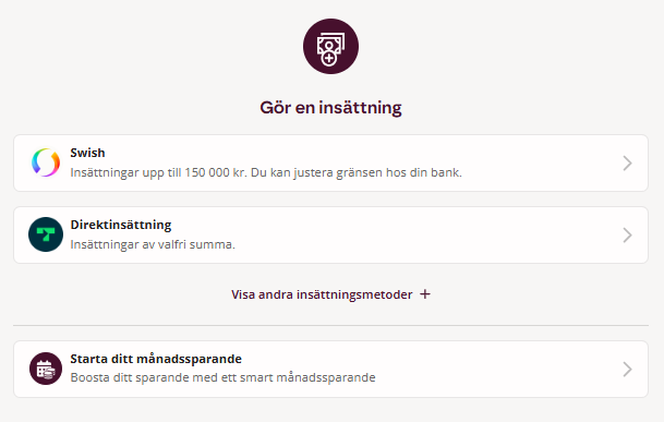 För att göra en insättning väljer du insättningsmetod i listan och följer instruktionerna. Tänk på att du väljer rätt konto i listan som du vill sätta in pengar till.