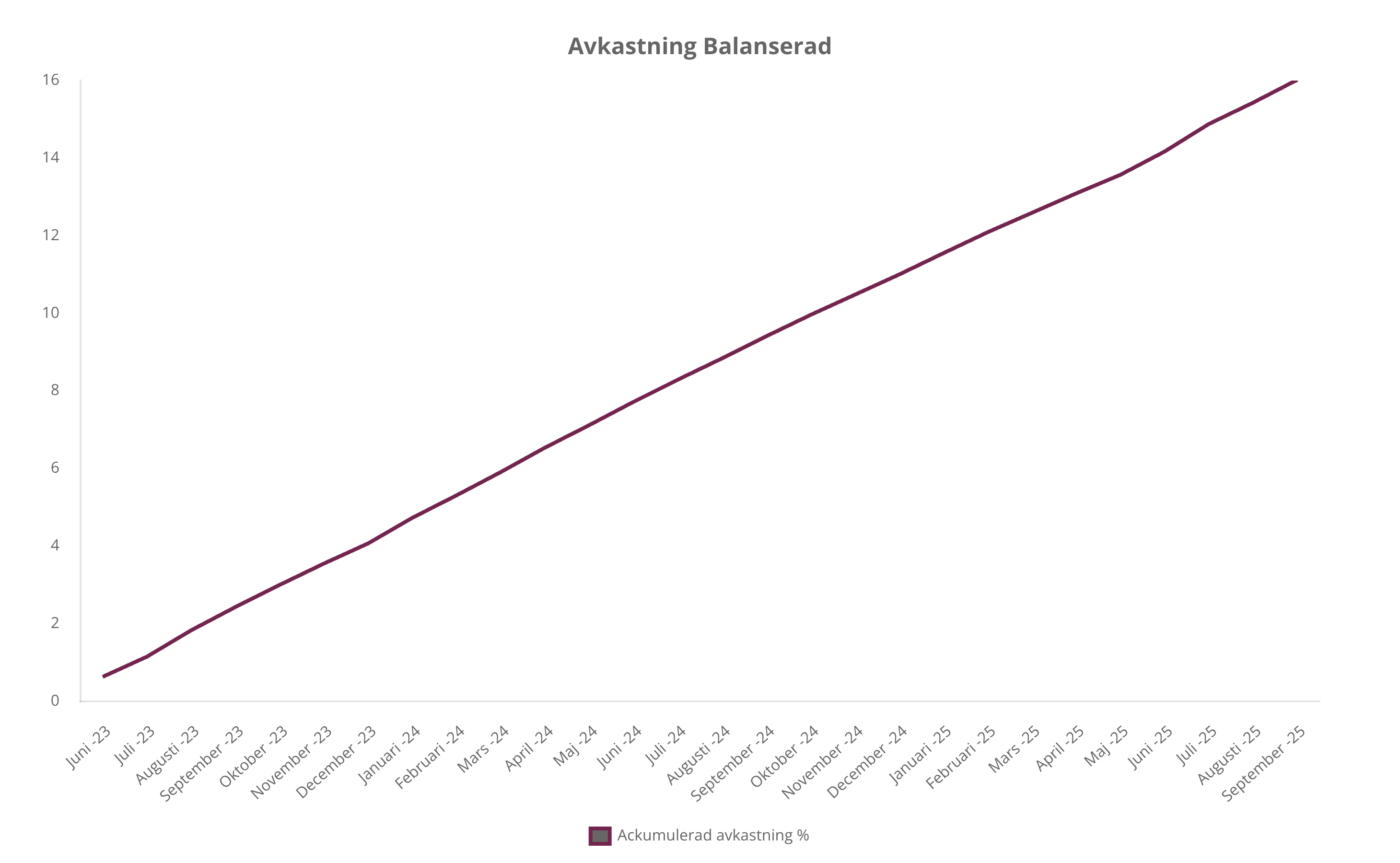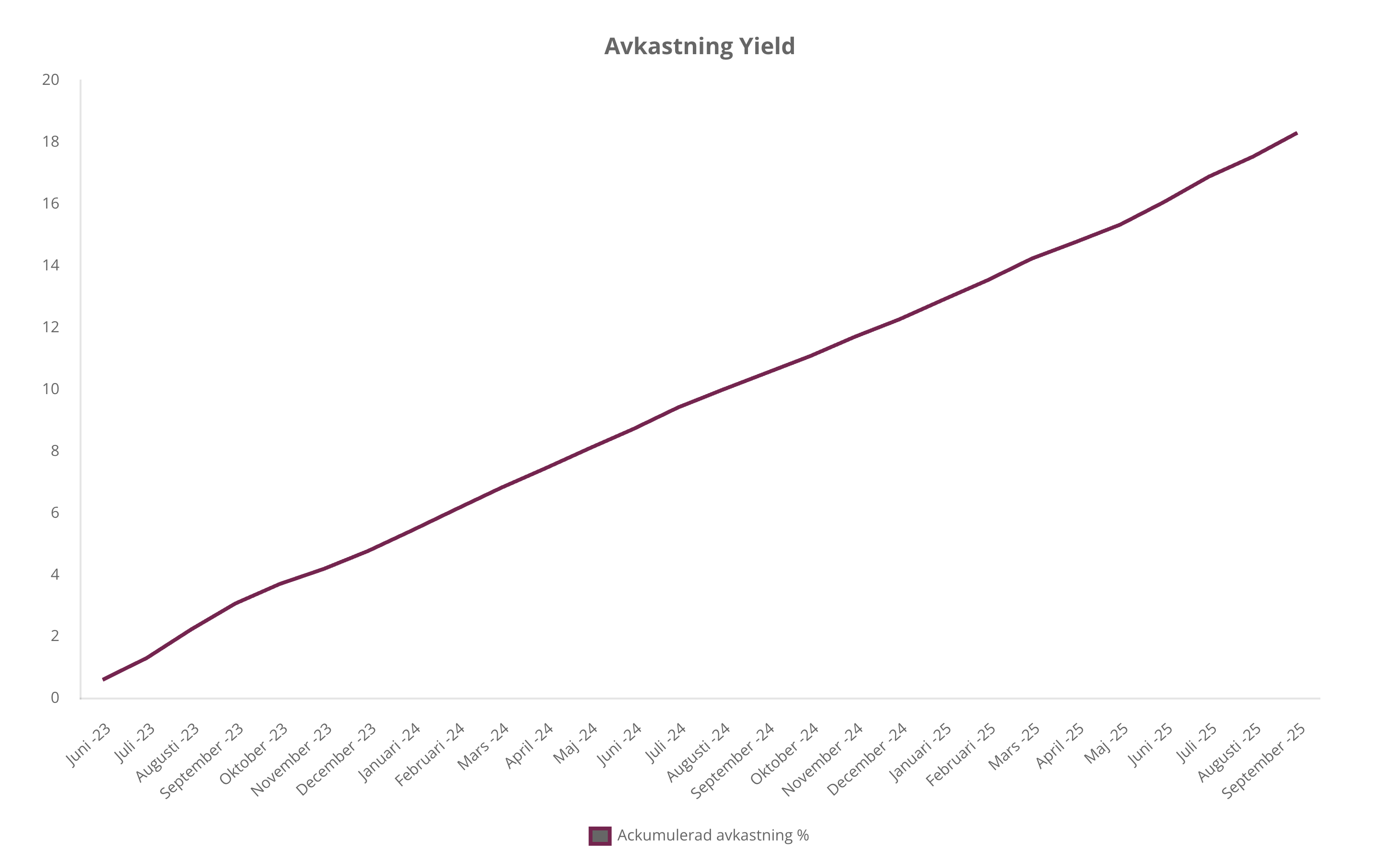 Den genomsnittliga ackumulerade avkastningen för sparstrategierna sedan start i juli 2023 uppgår till 16,02 % för Balanserad och 18,31 % för Yield, efter kreditförluster och före skatt. Strategierna har ingen månad med negativ avkastning.