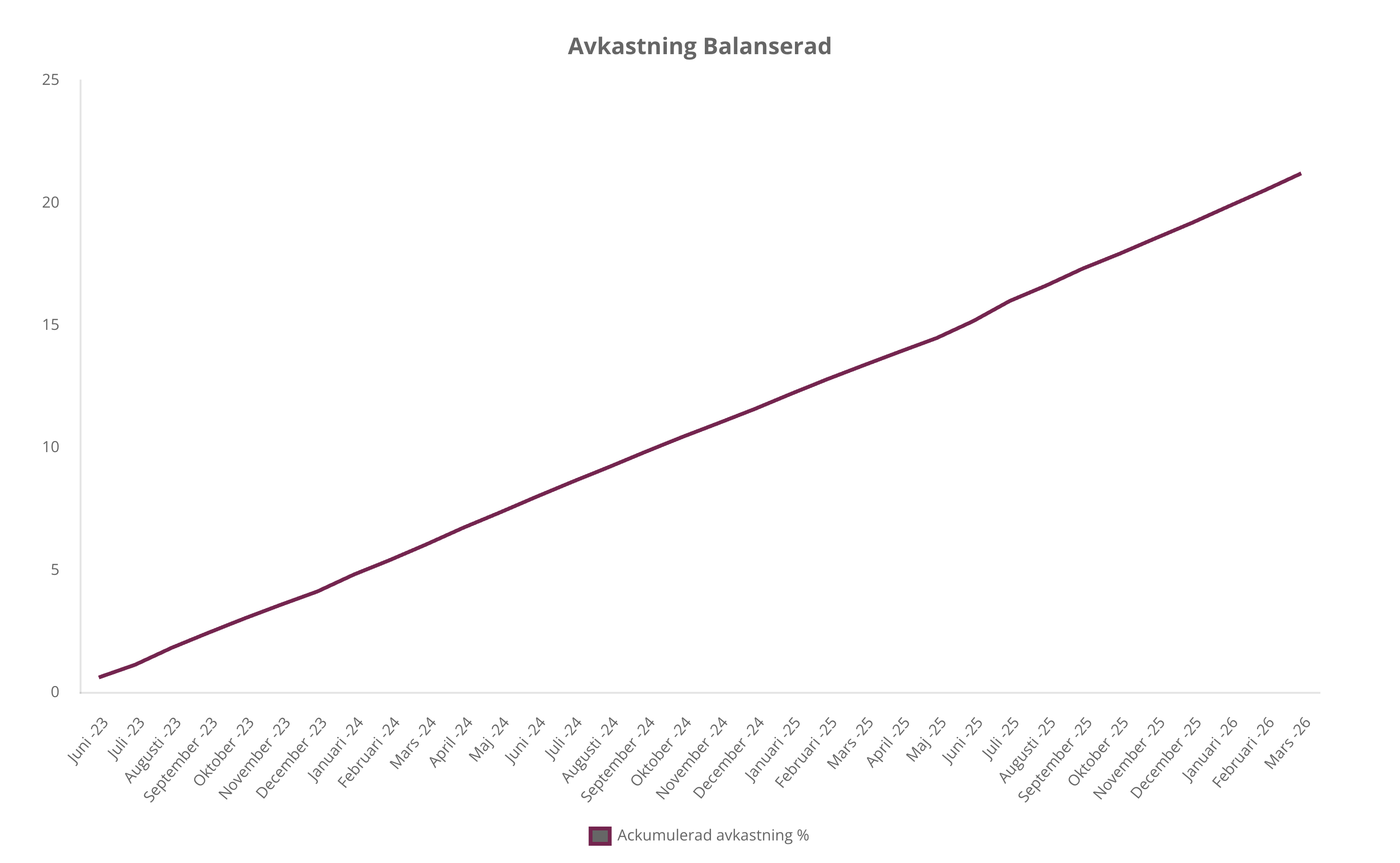 Avkastningen beräknas inklusive ränta-på-ränta och avser depåer med minst 2 000 SEK för Balanserad och 10 000 SEK för Yield, den lägstanivå som rekommenderas ur diversifieringssynpunkt. Se månadsvis avkastning och exponering under respektive strategi.