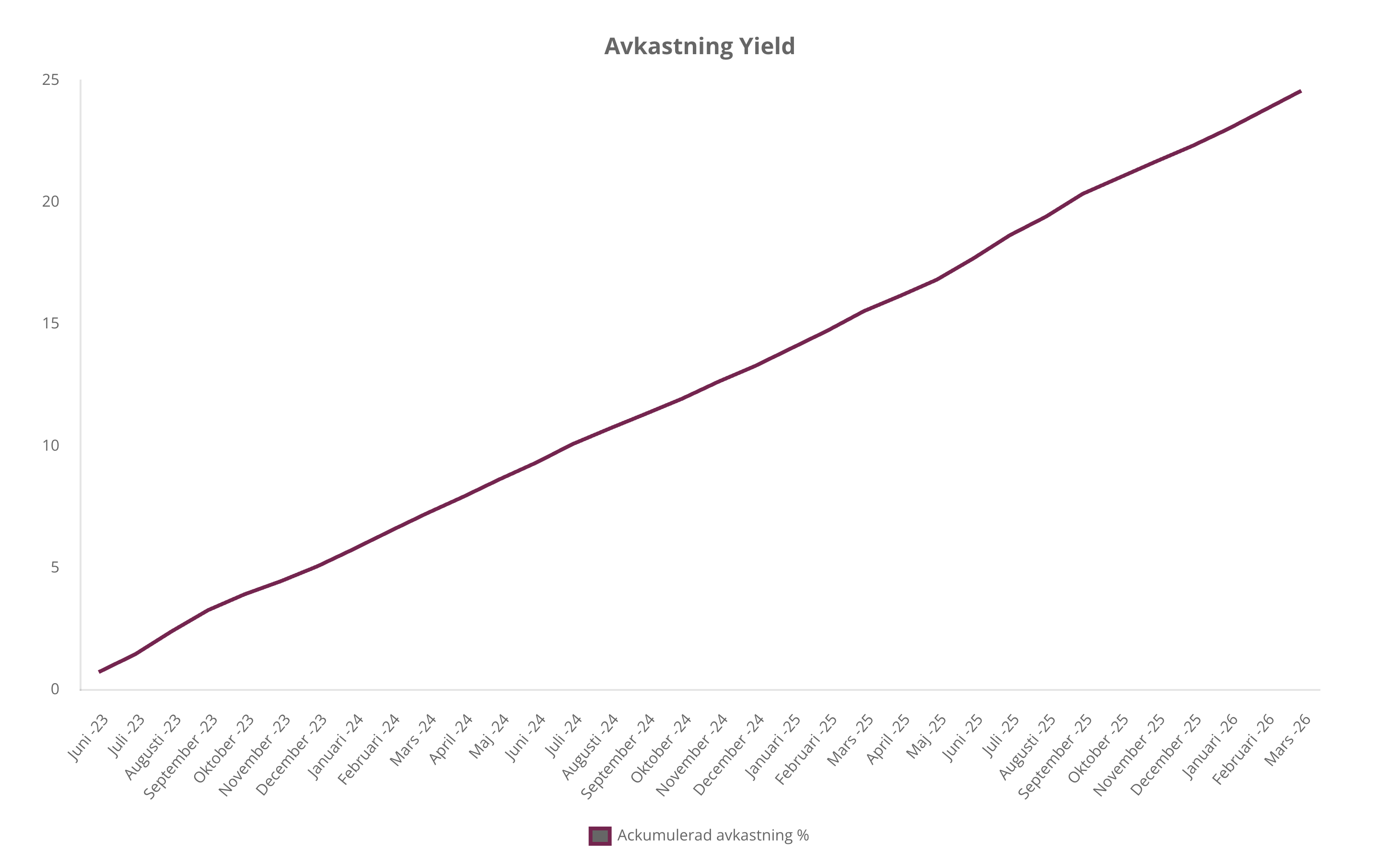Den genomsnittliga avkastningen för rullande 12 månader uppgår till 6,90 % – efter kreditförluster och avgifter, och före skatt. Sedan sparstrategin lanserades i juni 2023 har den ackumulerade genomsnittliga avkastningen uppgått till 21,21 %. Strategin har ingen månad med negativ avkastning.