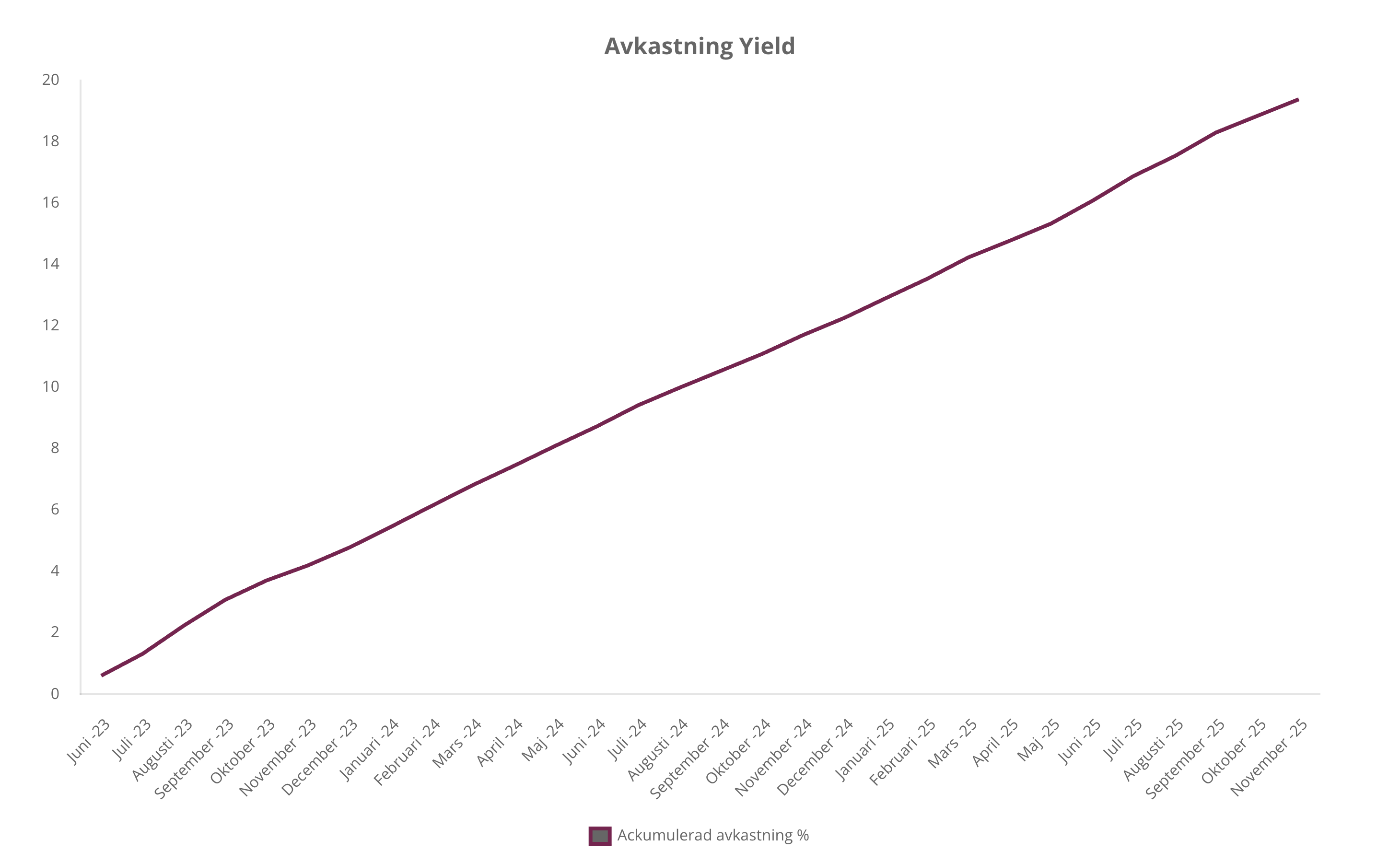 Den genomsnittliga ackumulerade avkastningen sedan start uppgår till 19,39 % – efter kreditförluster och före skatt. Strategin har ingen månad med negativ avkastning.