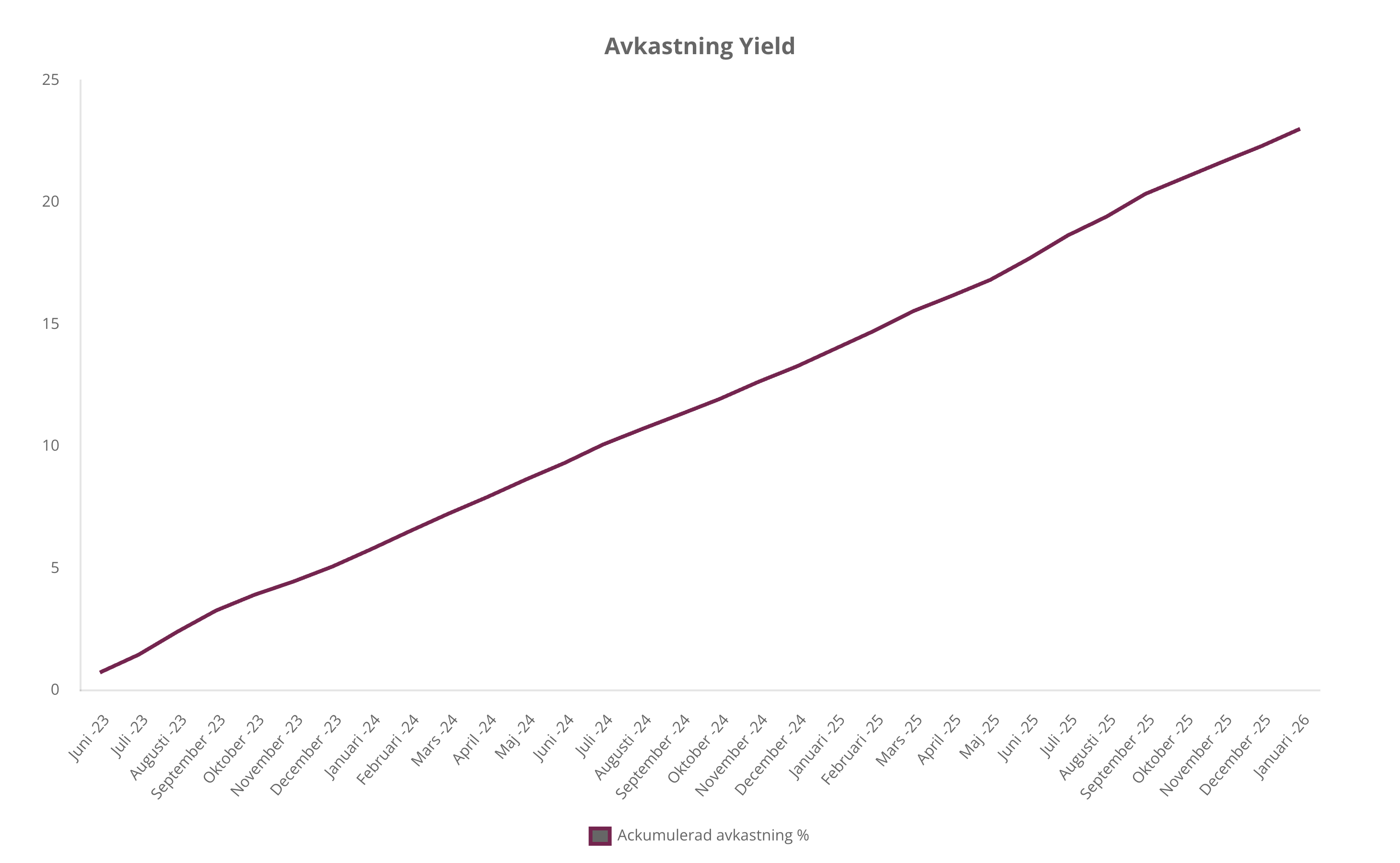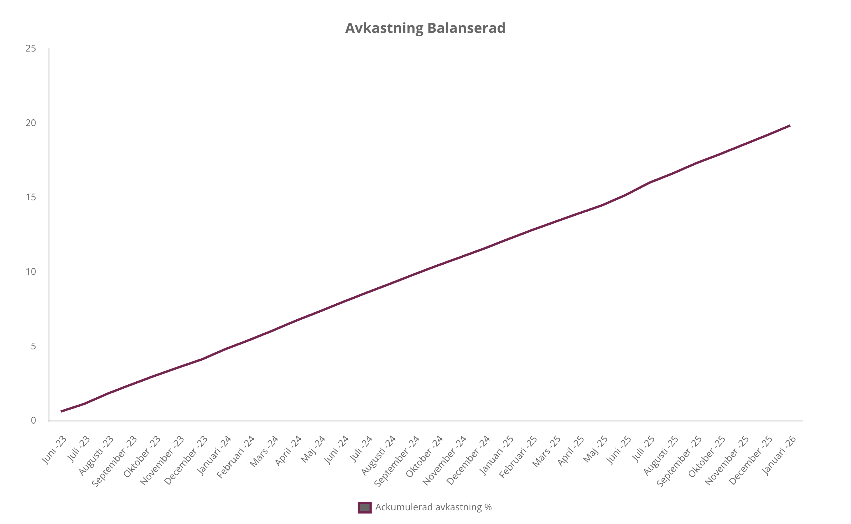 Avkastningen beräknas inklusive ränta-på-ränta och avser depåer med minst 2 000 SEK för Balanserad och 10 000 SEK för Yield, den lägstanivå som rekommenderas ur diversifieringssynpunkt. Se månadsvis avkastning och exponering under respektive strategi.