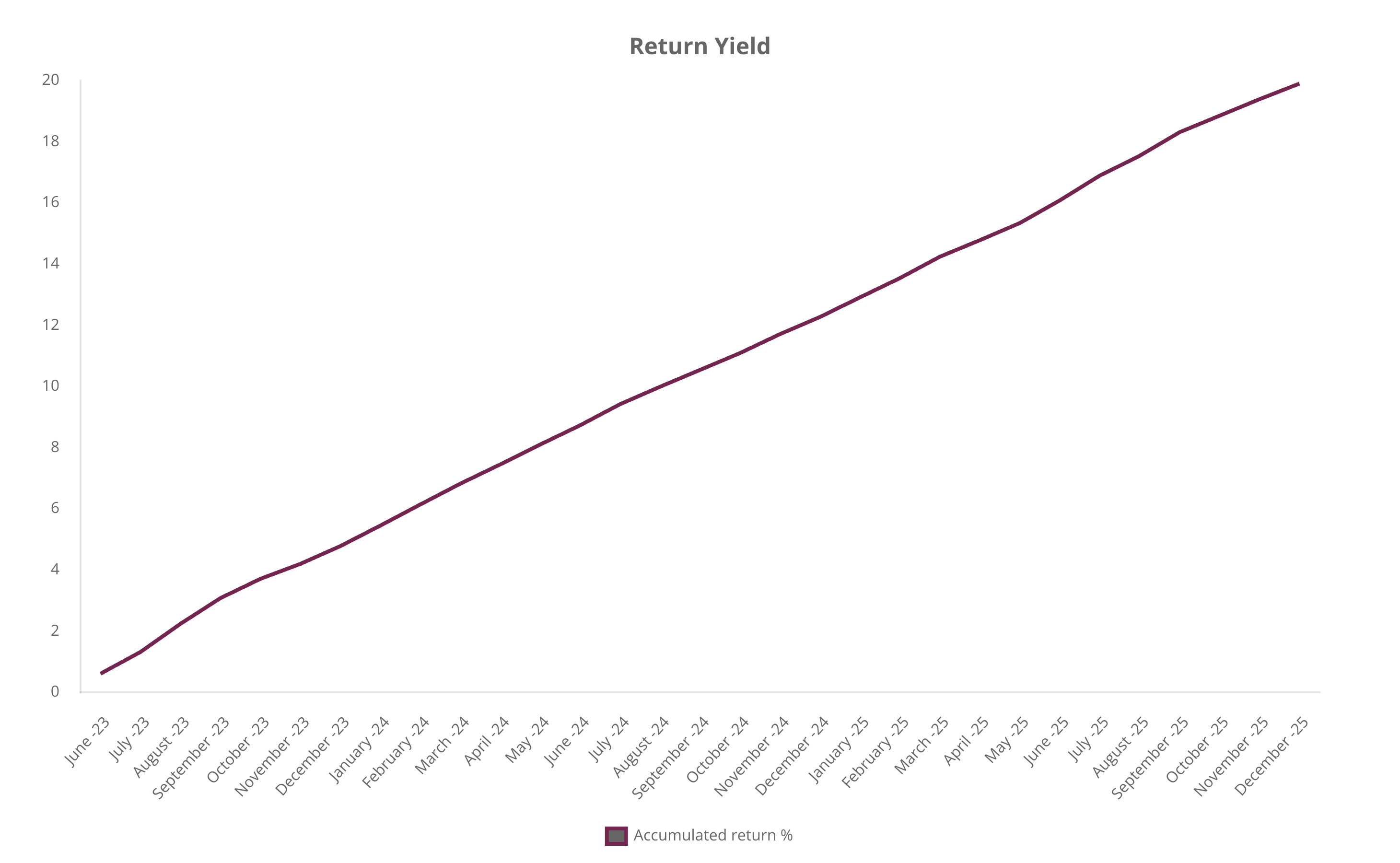 The average accumulated return since inception amounts to 19.90% – after credit losses and before taxes. The strategy has not recorded a single month of negative returns.