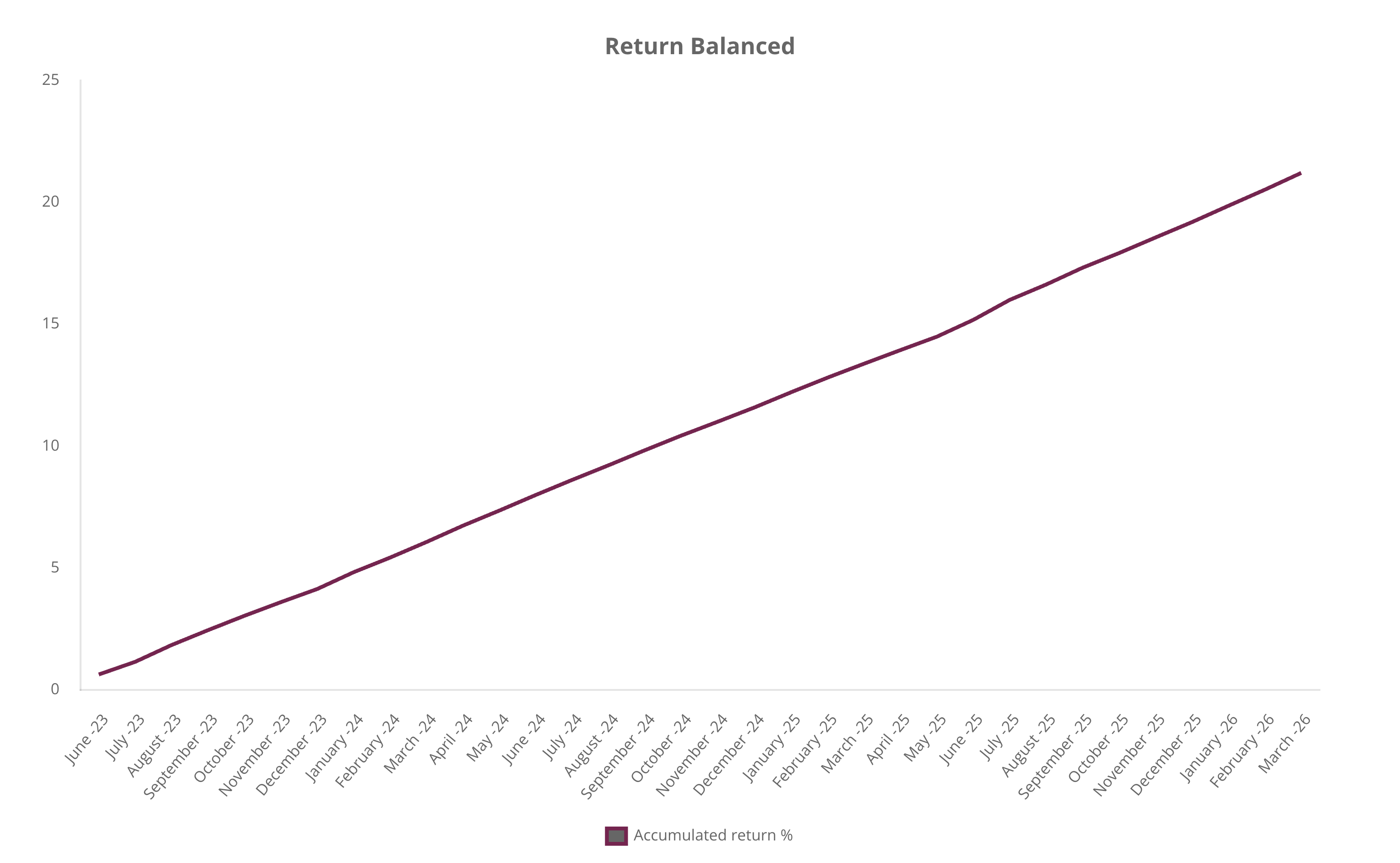 The average rolling 12-month return is 6.90% – net of credit losses and fees, and before tax. Since the savings strategy was launched in June 2023, the cumulative average return has amounted to 21.21%. The strategy has had no months with negative returns.