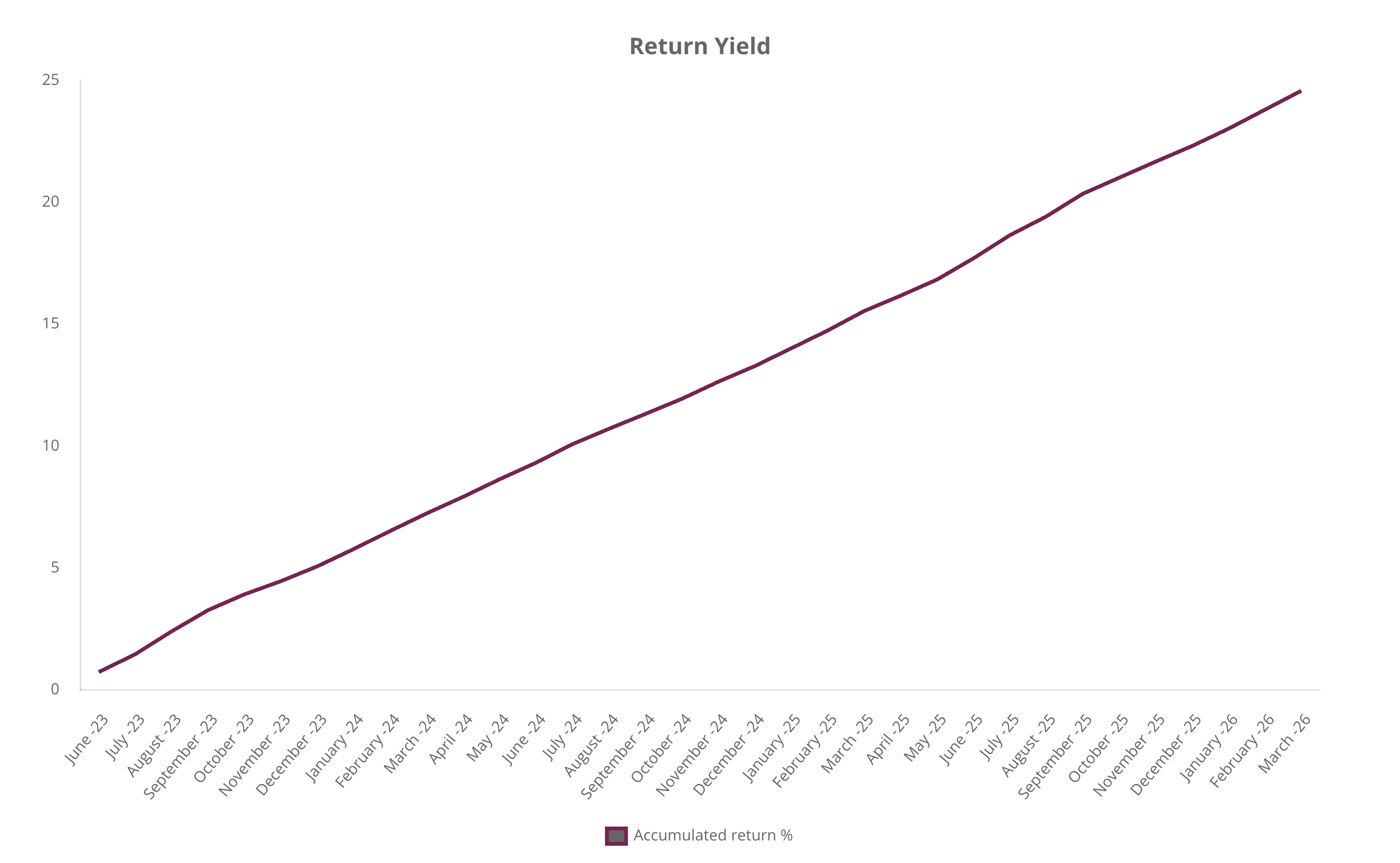 The average rolling 12-month return is 7.83% – net of credit losses and fees, and before tax. Since the savings strategy was launched in June 2023, the cumulative average return has amounted to 24.58%. The strategy has had no months with negative returns.
